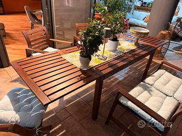 Tavolo in legno da esterno, allungabile, lunghezza 1,40/2,60, larghezza 78 cm, altezza 72 cm , completo di due poltrone da tavolo, una panchetta da due posti e due sedie richiudibili.