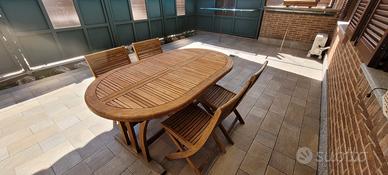 tavolo da esterno in legno, misure da chiuso L 1000 x 1700, misure da aperto L 1000 x 2300 con 6 sedie smpre in legno pieghevoli, valore da nuovo oltre 600 euro.