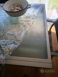 Tavolo allungabile fino a 170 cm,in vetro resistente e sedie color grigio chiaro seduta nera, impilabili. Per misure vedere nelle foto.