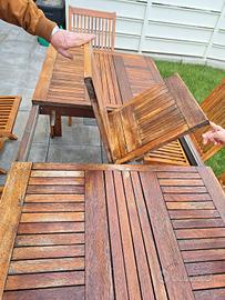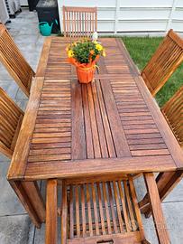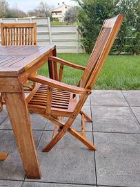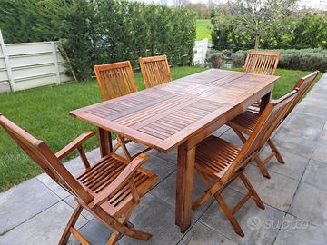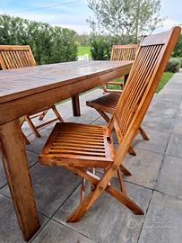 Vendo per cambio arredamento tavolo da esterno in legno massello teak, modello bounty con meccanismo di estensione centrale a "farfalla" che permette l'estensione da 180cm a 220cm in pochi passaggi, largo cm 90 e altezza cm 77; solido, robusto e funzionale, ideale per terrazzo e giardino, in buono stato, appena verniciato di olio di teak e compreso diamo una latta di olio. Compreso di 6 sedie abbinate pieghevoli da esterno sempre in legno di teak, di cui 2 con braccioli. Non spedisco, ritiro/consegna a mano. Prezzo finito e non trattabile.