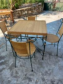 tavolo in ferro battuto e vimini di scozia con 4 sedie a scelta, normali o con braccioli. Sul piano c'è il vetro Misura 80x80. i tavoli sono disponibili in provincia di Alessandria volendo li possiamo consegnare con il trasporto a parte