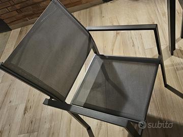Set tavolo e sedie. Praticamente nuovo 2 mesi di vita. Vendo per necessità di spazio . Tavolo in metallo con vetro fumè 100x100cm e segie con struttura in metallo.