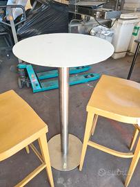 tavolo e sgabelli per angolo bar usati, si tratta di un tavolo con due sedie alte adatti per zona caffè in: bar, uffici, aree pubbliche, etc. sono un po' rovinati, guarda bene le foto. dimensioni: tavolo Ø59cm h110cm, sedie 43X44cm h106cm vendita solo in blocco a 120,00€
