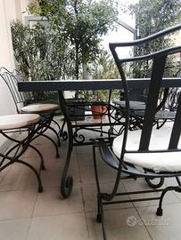 Vendo bellissimo tavolo da esterno terrazzo o giardino, lunghezza metri 2.00, larghezza metri 1.00, altezza metri 0.760, tutto in FERRO BATTUTO PIASTRELLATO, comprensivo di 8 sedie pieghevoli in FERRO BATTUTO, con relativi cuscini, condizioni ottime.