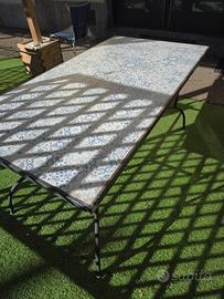 tavolo in ferro con piano in piastrelle presenta segni di ruggine come si può vedere in foto. il tavolo è smontabile con una chiave inglese ed è molto pesante il piano è 80cm×150cm