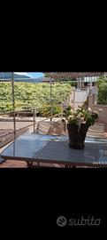 tavolo in ferro con vetro satinato con 4 sedie impilabili in ferro e seduta in PVC retato.