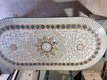 TAVOLO DA GIARDINO Tavolo realizzato interamente a mano da me personalmente. Il tavolo è composto da una base in ferro battuto trattata con antiruggine e verniciata con vernice da esterno. Il ripiano è costituito da un supporto in legno marino rivestito da un mosaico in marmo e ceramica rifinito con stucco cementizio. il tavolo e adatto all'esterno a tutte le intemperie mis. 100x200; alt. 78; euro 850 Sono in provincia di Reggio Emilia; per quanto riguarda la consegna posso effettuarla personalmente per poter ricevere ulteriori informazioni e foto di altri modelli e misure contattatemi Info: tel 3485443124