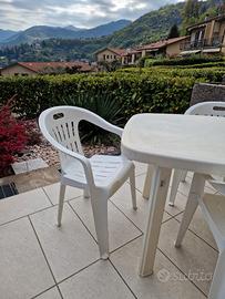 Tavolo da giardino Bianco completo di sedie. Predisposizione per ombrellone centrale. Perfette condizioni. Utilizzato pochissimo sempre tenuto al coperto. Dimensioni 140 x 85. Smontabile per il rimessaggio