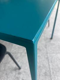 Tavoli da giardino robusti in ferro realizzati da un artigiano.Piccoli segni di usura. colore verde.