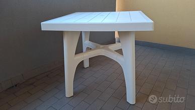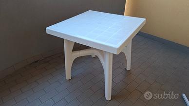 Tavolo da giardino marca Scab cm 80x80, altezza 75cm, smontabile dotato di foro centrale per ombrellone. Buonissime condizioni. Vendo completo di 4 poltroncine pieghevoli (marca Grand soleil), anch'esse in buonissime condizioni come in foto. No spedizione, solo consegna a mano.