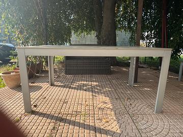 Grande tavolo da giardino, usato con qualche imperfezione, ovviamente data dal tempo ma perfetto nel suo dovere, ospita anchr 8 persone. Piú panchetta.
