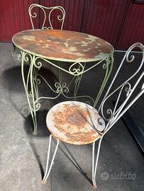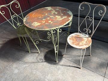 Tavolo in ferro battuto anni 70 con 2 sedie construiti a mano, da riverniciare. Diam. 78cm Presenta ruggine ma non parti corrose.