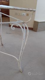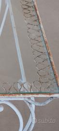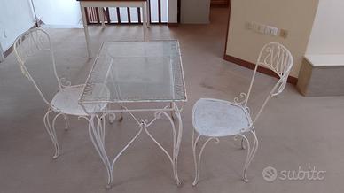 Grazioso tavolo con tre sedie in FERRO BATTUTO E VETRO. ORIGINALE ANNI 50. Di antiquariato. Realizzato a mano. Molto lavorato il ripiano dove poggia il vetro. Patina d' epoca. La terza sedia è in regalo. Da saldare una zampa.