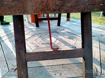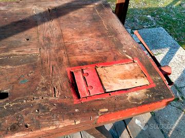 tavolo da falegname, caratteristica di questo tavolo, veniva usato per effettuare i lavori presso i domicili dei clienti, lo si può notare dai piedi pieghevoli e non fissi come gli altri tavoli da lavoro. e presente anche una morsa sul piano di lavoro, ed un'altra morsa attualmente smontata ma presente in foto, che si monta in uno degli angoli del tavolo. visto la rarità di questo tavolo il prezzo e poco trattabile, con i piedi piegati può essere trasportato con un veicolo SW , posso trasportarlo con un furgone nel raggio di 100 km previo rimborso spese. Per altre informazioni chiama
