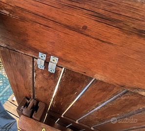 Tavolo in legno da giardino allungabile. Misure 156x90cm allungabile a 202cm Da aperto e’ possibile inserire un ombrellone. Come si puo vedere dalle foto il piano risulta essere rovinato in alcune zone, un listello è stato riparato con due staffe.