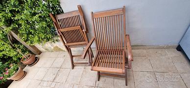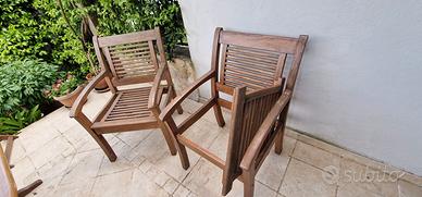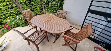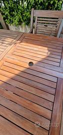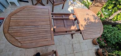 Tavolo in legno da giardino cm. 100x 180 estensibile a 240, completo di 2 sedie richiudibili più 2 poltroncine. Foro per ombrellone centrale. In buono stato, necessita solo di pitturazione stagionale. Solo ritiro diretto.