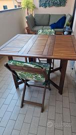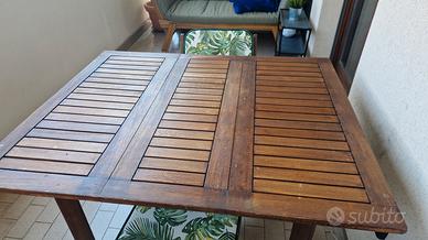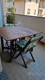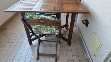 Vendo tavolo in legno di acacia per l'esterno con 2 sedie, marca Hanoi. Dimensioni del tavolo, 110cm x 90cm. Il tavolo è richiudibile.