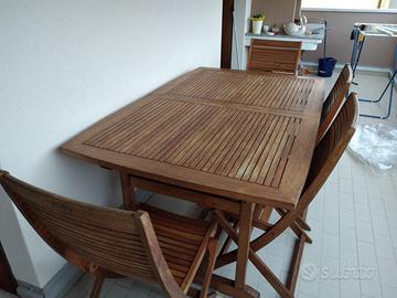Tavolo in legno teak da esterno, ben tenuto. Misura 156x100 con possibilità di allungarlo per altri 80cm. Compreso di 6 sedie pieghevoli.