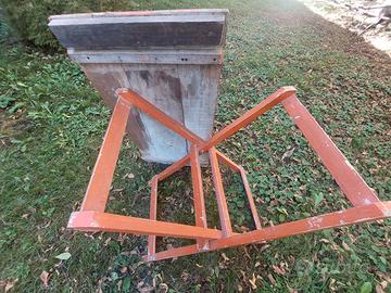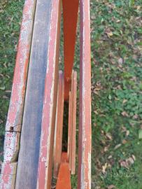 Tavolo in legno vintage con supporto ripiegabile. Comodo e pratico tavolo per bricolage o per emergenze. Dotato di un robusto cavalletto ad x richiudibile. Occupa un minimo spazio quando non lo si utilizza. Dimensioni piano cm 110 x 54, altezza cm 86, chiuso spessore cm 14. Spedisco solo con BRT