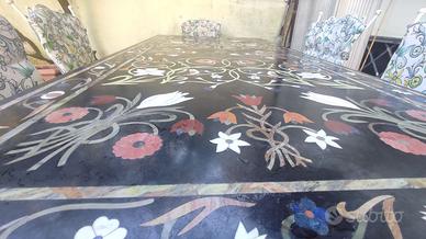 Elegante tavolo da esterno intarsiato con diversi marmi a motivo floreale. Piano rettangolare 90 x 180 cm spesso e molto pesante, appoggiato su basamento in marmo scolpito a doppio delfino.