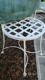 Il set comprende 6 sedie in ferro verniciato bianco con schienale decorato e seduta tonda a grata, inclusi cuscini imbottiti.