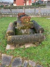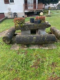 Tavolo da giardino antico con sedute di rulli agricoli adatto per colkezionisti ed un giardino stile antico adatto per appassionati ritiro a carico dell’acquirente
