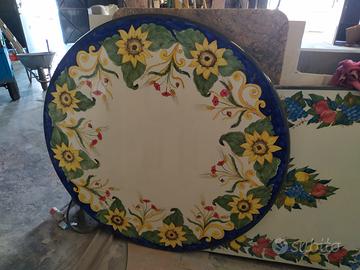 Vendesi tavolo rotondo in pietra lavica dell'Etna, decorato a mano e ceramizzato, diametro 132 cm, spessore 3 cm.