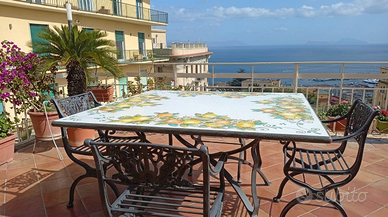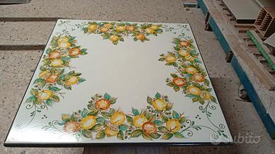 Aggiungi un tocco di eleganza mediterranea e di autentica arte italiana alla tua casa o al tuo giardino. Proponiamo questo splendido tavolo quadrato in pietra lavica, un pezzo unico che unisce la forza millenaria della roccia vulcanica alla raffinatezza della decorazione ceramica tradizionale.