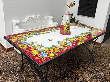 ANNUNCIO PUBBLICATO A NAPOLI MA VALIDO PER TUTTA ITALIA. LA SPEDIZIONE VERRÀ EFFETTUATA PRESSO IL DOMICILIO DEL CLIENTE DA UN NOSTRO CORRIERE DI FIDUCIA. Tavolo misura cm 200x100 cm. realizzato interamente a mano da artigiani napoletani specializzati nella lavorazione e nella decorazione della pietra lavica. La pietra lavica garantisce resistenza assoluta a calore, intemperie e usura, mentre il decoro dipinto a mano rende questo pezzo unico e irripetibile. Articolo esclusivo con le decorazioni che potete ammirare in foto. Prezzo comprensivo di base in ferro battuto zincata e 6 sedie in ferro battuto con inserto sullo schienale. Spedizione al domicilio compresa nel prezzo.