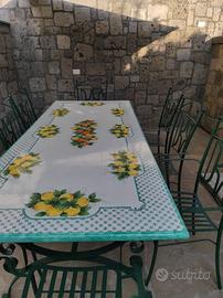 ANNUNCIO PUBBLICATO A NAPOLI MA VALIDO PER TUTTA ITALIA. LA SPEDIZIONE VERRÀ EFFETTUATA PRESSO IL DOMICILIO DEL CLIENTE DA UN NOSTRO CORRIERE DI FIDUCIA. Tavolo misura cm 200x100 cm. realizzato interamente a mano da artigiani napoletani specializzati nella lavorazione e nella decorazione della pietra lavica. La pietra lavica garantisce resistenza assoluta a calore, intemperie e usura, mentre il decoro dipinto a mano rende questo pezzo unico e irripetibile. Articolo esclusivo con le decorazioni che potete ammirare in foto. Prezzo comprensivo di base in ferro battuto zincata e 6 sedie in ferro battuto con inserto sullo schienale. Spedizione al domicilio compresa nel prezzo.