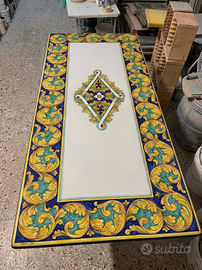 Splendido tavolo rettangolare in vera pietra lavica dell'Etna misura 200x100cm, interamente decorato a mano da maestri ceramisti della tradizione napoletana. Ideale per dare un tocco di eleganza mediterranea a giardini, terrazzi o zone living interne.