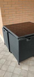 vendo tavolo in rattan e vetro temperato quadrato 1,10×1,10 con 4 poltrone con poggia piedi e cuscini seduta e schienale anche imballato mai usati che si infilano perfettamente sotto il tavolo per non ingombro