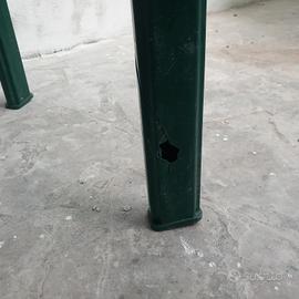 tavolo in resina verde con buco per ombrellone leggermente danneggiato, ma buono e sicuro da usare. no sedie.