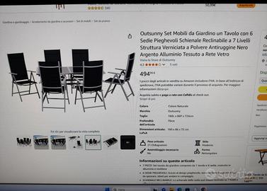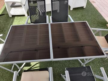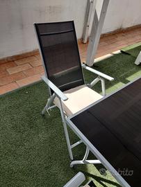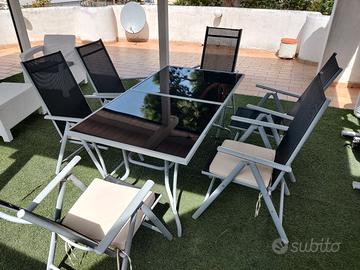 Tavolo da esterno in vetro con sei sedie reclinabili. Pari al nuovo, acquistato estate scorsa (500€), gia' smontato e di facile trasporto. Vendo per cambio abitazione. Se acquistato insieme al set di divani bianco il prezzo finale in blocco è 350€ con un risparmio del 50% visto che sono pari al nuovo
