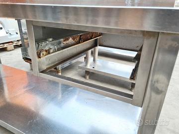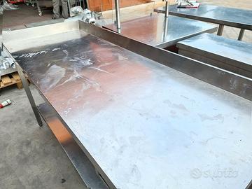 tavolo inox con alzatina angolare usato, si tratta di un tavolo totalmente in acciaio inossidabile adatto per ambienti alimentari per la preparazione di piatti. dotato di ripiano inferiore e alzatina angolare (probabilmente per posizionarlo nell'angolo del muro), avrebbe il cassetto ma è mancante.
