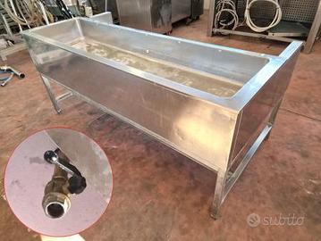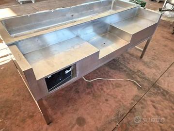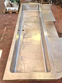 tavolo inox lavoro con vasca usato, in realtà si tratta di un modulo riscaldato bagnomaria per mensa professionale ma noi lo vendiamo come tavolo per preparazione di alimenti (potrebbe anche funzionare ma non lo proviamo). completamente fatto in acciaio inox la vasca dispone di scarico.