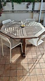 tavolo legno marchio di design di pregio UNOPIÙ esagonale con foro centrale per ombrellone.