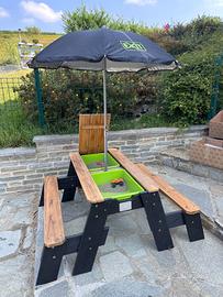 Tavolino per bambini con panche regolabili in distanza, coperchio apribile con contenitori all'interno da usare come Sabbiere o semplicemente come porta giochi , ombrellone, in legno di pino, appena smontato tutto, sabbiato tutto e ridato impregnante protettivo