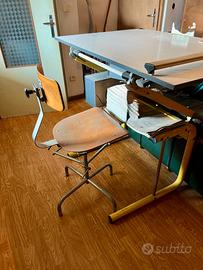 Tavolo con robusta struttura in ferro di colore giallo e piano regolabile in altezza ed inclinazione. Completo di sgabello regolabile