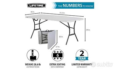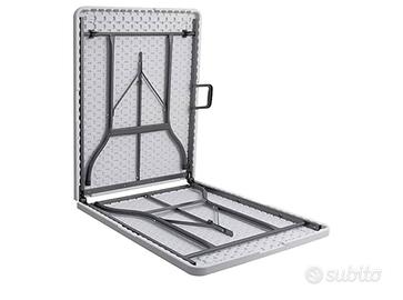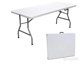 Vendo tavolo rettangolare pieghevole professionale, ideale per giardino, campeggio, fiere o come tavolo aggiuntivo per feste e sagre. • Dimensioni: 180 x 75 x 74 cm (aperto). • Materiale: Piano in dura resina HDPE (super resistente e facile da pulire) con struttura in acciaio verniciato. • Portabilità: Si chiude a metà diventando una comoda valigetta con maniglia integrata. Salvaspazio e facilissimo da trasportare. • Condizioni: Ottimo stato, robusto e stabile. Perfetto sia per interno che per esterno.