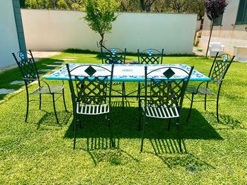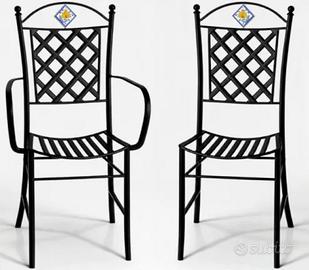 Sedie: Set di 6 sedie in ferro battuto, arricchite da un raffinato tozzetto decorativo sullo schienale che riprende il decoro del tavolo.