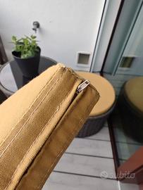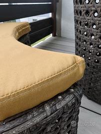 Set da terrazza o giardino in polyrattan composto da 5 pezzi: 2 sedute in stile pouff + un tavolino con base in vetro fum+ e 2 cuscini. tavolino altezza 50 cm, diametro 50 cm con base in vetro fumè. poff che fungono da sedute aggiuntive: larghezza 56cm x 32cm altezza completi di cuscini artigianali tagliati a misura, lavabili e sfoderabili in colore giallo. ideali per piccoli spazi Tutto come da foto e in buone condizioni. Solo ritiro a mano. Si trova a Bressanone (BZ). Solo ritiro a mano