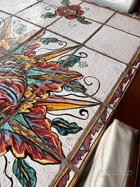 Tavolo in ferro battuto 90 × 160, rivestito con maioliche in ceramica lavorata artigianale cilentana, firmata Stile, completo con 4 sedie con cuscini e schienale e 1 panca di 2 posti con rivestimento come da foto, il tavolo è in ottime condizioni, perfetto per terrazzi, giardini, pergolati, info in privato.