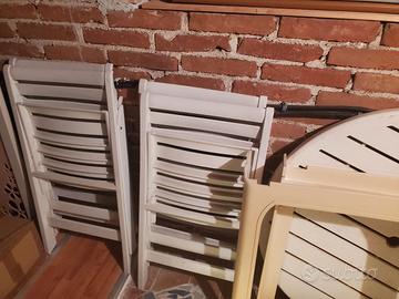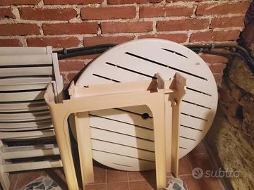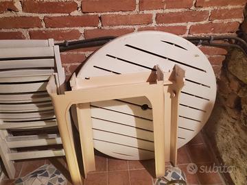 tavolo rotondo di 90cm con 4 sedie. sembra legna rivestito di plastica è pesante e molto stabile anche con il libeccio.