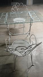 Vendo tavolo con vetro(unico pezzo)con due sedie e panchina (esemplare raro)in ferro battuto da giardino a 450 euro trattabili.