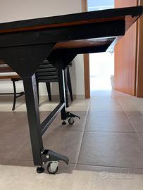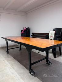 Vendo tavolo con struttura in ferro e piano in legno misure 92cm X 280cm. Completo di piedi regolabili e ruote per spostarlo. Tavolo molto robusto e solido e per questo utilizzabile anche come bancone da lavoro/hobby. PREZZO TRATTABILE