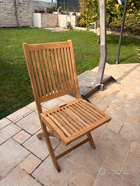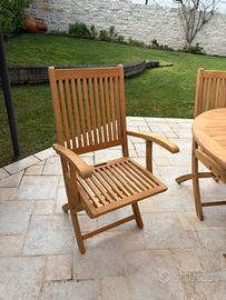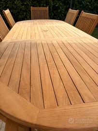 Tavolo in teak color miele. Completo di 8 sedie, di cui due con braccioli e 6 senza.