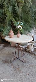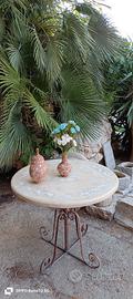 tavolino artigianale con piano rotondo in pietra naturale decorato a mano e base in ferro battuto lavorato. Ideale per giardino, veranda o angolo relax in stile rustico ed elegante.