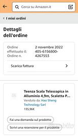 Vendo scala telescopica in alluminio ancora nel suo imballaggio originale per inutilizzo. Metto in allegato anche lo screen di amazon con data e prezzo di acquisto. Mai usata. Prezzo non trattabile. No spedizioni.