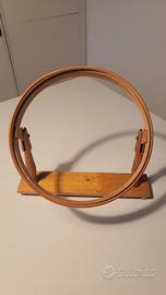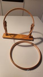 Vendo telaio a cerchietto con base in legno e chiusura a vite per ricamare. Il telaio ha un diametro di 27 cm ed è tenuto bene.